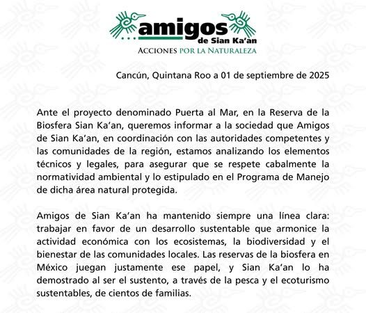 Afirman que analizan las implicaciones del proyecto para asegurar el respeto a la normativa ambiental.Cancún, 1 de septiembre.- La organización Amigos de Sian Ka’an emitió un comunicado oficial en el que informa que está analizando el proyecto Puerta al Mar, propuesto para ser desarrollado en la Reserva de la Biósfera Sian Ka’an.La asociación, en colaboración con las autoridades pertinentes y las comunidades locales, busca garantizar que el proyecto se apegue estrictamente a la normativa ambiental y a las directrices establecidas en el programa de manejo de esta área natural protegida.En el comunicado, Amigos de Sian Ka’an subraya su compromiso de toda la vida con el desarrollo sostenible. La organización sostiene que cualquier iniciativa en la región debe armonizar la actividad económica con la protección de los ecosistemas, la biodiversidad y el bienestar de las comunidades.Destacan el papel crucial de las reservas de la biósfera en México, poniendo a Sian Ka’an como ejemplo de cómo la pesca y el ecoturismo sostenible pueden sustentar a cientos de familias.La asociación reitera su postura firme de que la integridad de Sian Ka’an y sus recursos naturales debe ser protegida ante cualquier proyecto. Este compromiso incluye el respeto al marco legal nacional e internacional, especialmente a los acuerdos adquiridos cuando Sian Ka’an fue inscrita como Sitio de Patrimonio Mundial de la Unesco.Amigos de Sian Ka’an concluyó su comunicado enfatizando la importancia de la participación de quienes habitan el territorio para la toma de decisiones sobre su futuro.