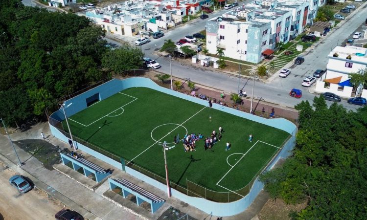 Cancún, Q. R., a 28 de diciembre de 2025.- Con el firme compromiso de seguir impulsando el deporte como motor de transformación social, la presidenta municipal, Ana Paty Peralta, y la gobernadora, Mara Lezama Espinosa, entregaron la cancha de pasto sintético en la Supermanzana 258, fraccionamiento “Arcos Paraíso”, un lugar para que las niñas, niños y jóvenes puedan jugar, convivir y soñar.
