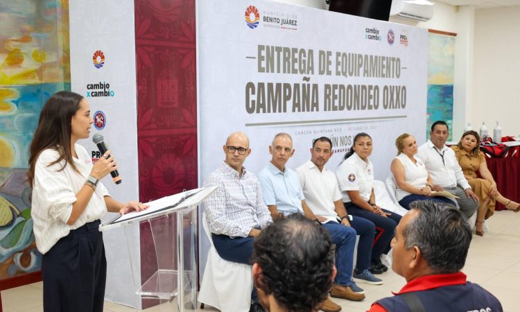 Cancún, Q. R., a 23 octubre de 2025.- En un acto que refleja el compromiso conjunto entre el gobierno municipal encabezado por la presidenta, Ana Paty Peralta y el sector empresarial, se llevó a cabo la entrega de equipamiento al Heroico Cuerpo de Bomberos de Benito Juárez, gracias a los fondos recaudados a través del programa “Redondeo OXXO”.