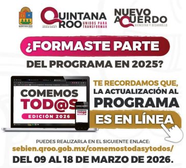 CancúnDestacadasLanza Mara Lezama registro de “Comemos Todas y Todos 2026” en Quintana RooRedacción1 mes ago56La Gobernadora informó que las inscripciones se realizan este 6 de marzo de 9:00 a 17:00 horas en módulos de...