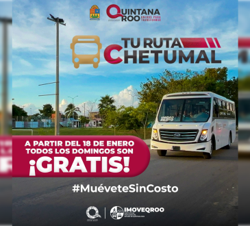 CancúnDestacadasInvita Imoveqroo a disfrutar Chetumal con transporte público gratuito los domingosRedacción3 meses ago90Anuncia la gobernadora Mara Lezama: Tu Ruta Chetumal gratis, en apoyo a la economía familiar, promover la convivencia social y...