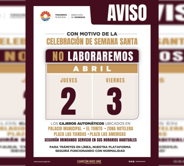 CancúnDestacadasAnuncia Ayuntamiento de BJ cierre de cajas por Semana Santa; habilitan pagos en línea y cajeros 24 horasRedacción2 semanas ago32Cancún, Q. Roo.- El Ayuntamiento de Benito Juárez, a través de la Tesorería y la Dirección de Ingresos, informó el...