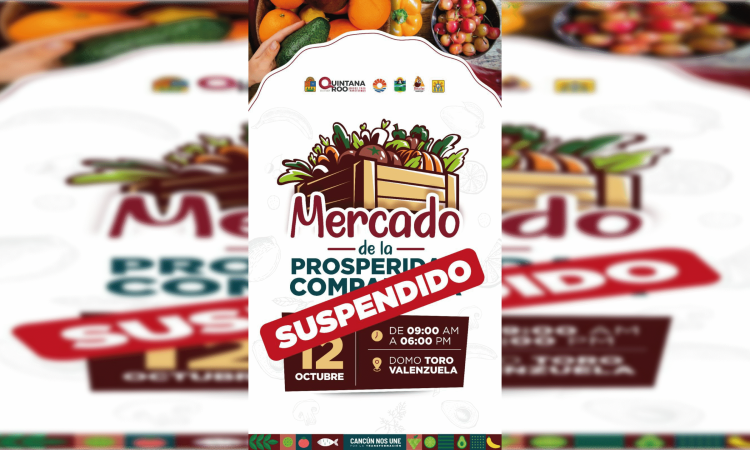 Cancún, Q. R., a 10 de octubre de 2025.- El Gobierno del Estado de Quintana Roo, en coordinación con el Ayuntamiento de Benito Juárez, informa que el evento “Mercado de la Prosperidad Compartida”, programado para el domingo 12 de octubre en el Domo Toro Valenzuela, queda suspendido hasta nuevo aviso.