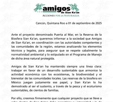 CancúnDestacadasAmigos de Sian Ka’an se pronuncian sobre el proyecto ‘Puerta al Mar’Redacción1 mes ago47Afirman que analizan las implicaciones del proyecto para asegurar el respeto a la normativa ambiental.Cancún, 1 de septiembre.- La organización...