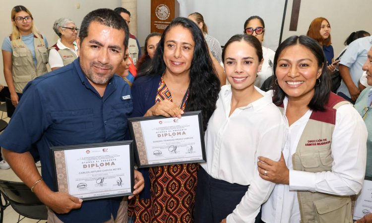 Acompañada de los integrantes del presídium, en el que se incluyó el director general de la Casa de los Saberes Jurídicos, Jorge Arturo Martínez Arufe, sede del evento, la presidenta municipal entregó 30 constancias, dos reconocimientos y 34 diplomas a los participantes del taller y ponentes del mismo.