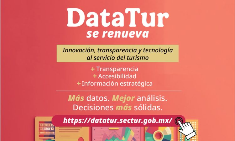 La nueva versión de DataTur ya se encuentra disponible para consulta pública en https://datatur.sectur.gob.mx/  y posiciona a México como uno de los países con mayor avance en la generación y difusión de datos turísticos estratégicos.