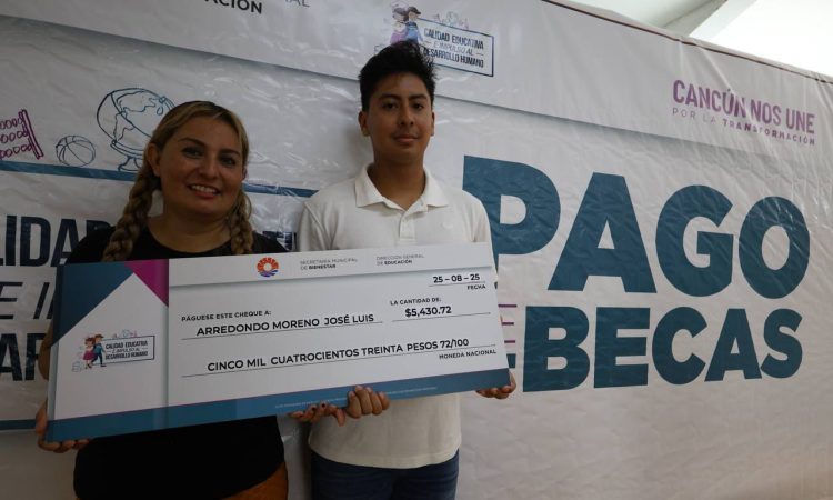 Cancún, Q. R., a 25 de agosto de 2025.- El Ayuntamiento de Benito Juárez, que encabeza la presidenta municipal, Ana Paty Peralta, a través de la Secretaría Municipal de Bienestar y la Dirección General de Educación, inició con el pago de más de 3 mil becas para estudiantes de escuelas públicas de los niveles Especial, Preescolar, Primaria, Secundaria, Media Superior y Superior, beneficiando a la economía de las familias cancunenses y combatiendo la deserción escolar.