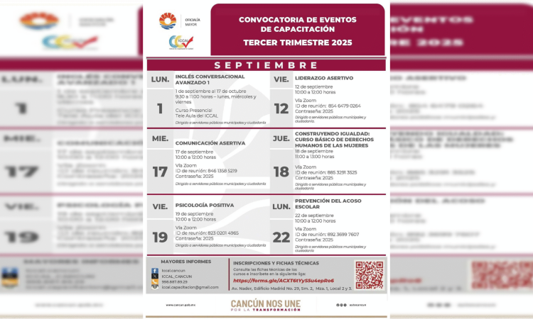 En otros conceptos, se llevará a cabo el curso sobre “Liderazgo asertivo”, este viernes 12 de septiembre; “Comunicación asertiva”, el miércoles 17 de septiembre; y “Psicología positiva”, programado para el viernes 19 de septiembre, todos de 10:00 a 12:00 horas vía Zoom.