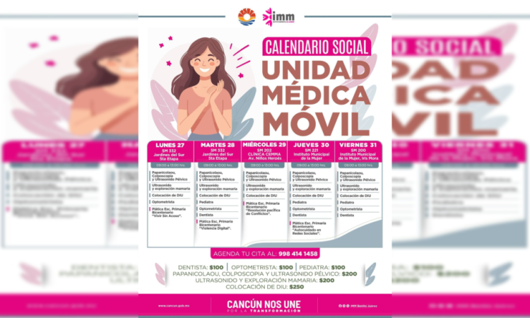Cancún, Q. R., a 26 de enero de 2025.- El Instituto Municipal de la Mujer (IMM) del Ayuntamiento de Benito Juárez dio a conocer que del 27 al 31 de enero llevarán los servicios de la Unidad Médica Móvil a diversas Supermanzanas de la ciudad, con la intención de ofrecer servicios de salud a bajo costo para las cancunenses.