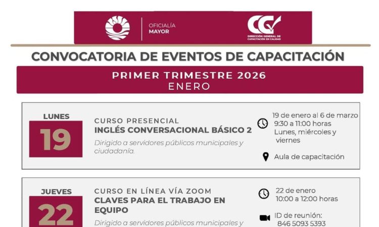 Después, se tendrá el contenido sobre: “Claves para el trabajo en equipo”, que se dará el jueves 22 de enero en línea por medio de la plataforma de videoconferencias Zoom, misma vía por la que se dará el concepto: “Lenguaje incluyente y con enfoque de derechos”, el miércoles 28 de enero, ambos de 10:00 a 12:00 horas.