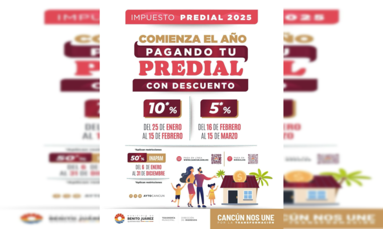 Cancún, Q. Roo.- El Ayuntamiento de Benito Juárez, a través de la Tesorería Municipal y la dirección de Ingresos, recordó a los ciudadanos y contribuyentes que la tercera etapa de la campaña “Comienza el año pagando tu predial con descuento” iniciará este domingo 16 de febrero, con 5 por ciento de descuento autorizado en ese concepto.