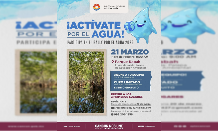 Cancún, Q. R., a 18 de marzo de 2026.- Previo a la conmemoración del Día Mundial del Agua que es el 22 de marzo, el Ayuntamiento de Benito Juárez, a través de la dirección general de Ecología, invita a la ciudadanía en general a inscribirse y participar en el “Rally por el agua 2026”, que se realizará el próximo sábado 21 de marzo en el Parque Kabah.