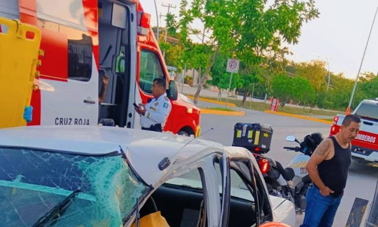 Cancún, 13 de julio.- Elementos del Heroico Cuerpo de Bomberos Cancún acudieron esta mañana a un llamado de emergencia en la avenida Huayacán, donde se reportó un accidente de tránsito en el que un conductor quedó atrapado, dentro de un vehículo tipo Tsuru.