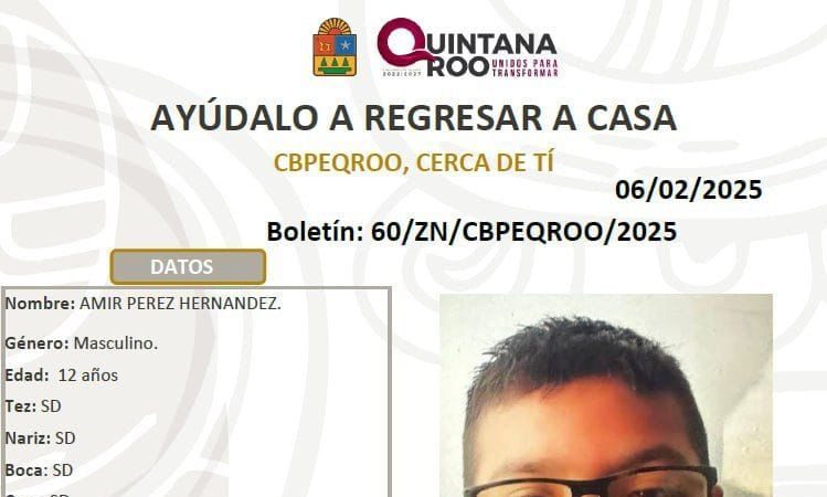 Cancún, 7 de febrero.- En un operativo de búsqueda conjunto, las autoridades localizaron sano y salvo a Amir Pérez Hernández, un menor de 12 años cuya desaparición se reportó en la Región 229 de Benito Juárez.