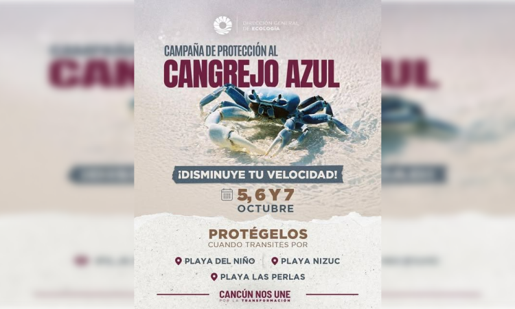 Cancún, Q. R., a 03 de octubre de 2025.- El Ayuntamiento de Benito Juárez, a través de la dirección de Ecología Municipal, invita a la ciudadanía a participar en la campaña de protección al cangrejo azul, que se realizará del 5 al 7 de octubre.