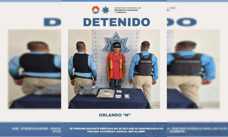 Cancún, 30 de julio.- Agentes de la Secretaría Municipal de Seguridad Ciuda-dana y Tránsito de Benito Juárez detuvieron a Orlando “N”, de 22 años de edad, por su presunta participación en delitos contra la salud.Los hechos ocurrieron en las inmediaciones del kilómetro 18 de la Zona Hotelera, cuando agentes de la Policía Turística realizaban recorridos de prevención y vigilancia.Durante el patrullaje, se percataron de un individuo que manipulaba presuntos estupefa-cientes en la vía pública.Tras intervenir y realizarle una inspección de seguridad, le fueron aseguradas 12 bolsitas transparentes con hierba verde y seca, con características similares a la marihuana; 13 bolsitas con material rocoso y cristalino, presuntamente cristal, seis bolsitas con fragmen-tos amarillentos, presuntamente crack, así como un teléfono celular.El sujeto fue detenido y puesto a disposición de la Fiscalía Especializada en Combate al Delito de Narcomenudeo para las diligencias legales conducentes.