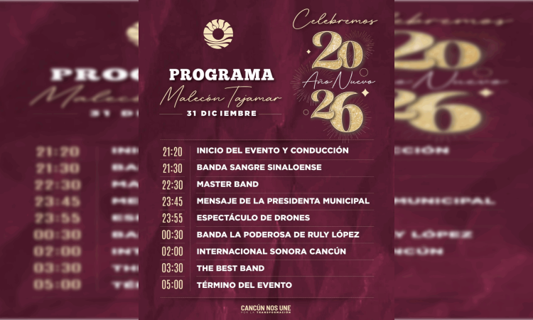 Música en vivo, feria, gastronomía sin venta de alcohol y show de 250 drones este 31 de diciembre.La funcionaria detalló que esta será la segunda ocasión en que se organiza esta celebración en el emblemático espacio público, como parte del cierre de las actividades decembrinas y con la expectativa de superar la asistencia registrada el año pasado.El programa incluye la participación de más de cinco grupos locales, con géneros como banda, salsa y merengue. Además, se instalará un pabellón gastronómico con oferta de productores de la región, así como un pabellón de artesanos y emprendedores.Desde las 19:00 horas estarán disponibles juegos inflables para niños, así como la feria tradicional, con el objetivo de que las familias puedan acudir desde temprano y permanecer durante la noche.En entrevista con Capital Noticias explicó que las personas asistentes podrán llevar sus propios alimentos, con la recomendación de hacerlo en envases de plástico por motivos de seguridad, o bien consumir en los espacios habilitados para la venta de comida.Uno de los momentos centrales de la noche será el conteo para recibir el Año Nuevo, seguido de un espectáculo de drones con más de 250 unidades iluminando el cielo de Tajamar. De acuerdo con la Secretaría del Bienestar, el show busca repetir el impacto visual que tuvo la edición anterior.El evento no contempla la venta de bebidas alcohólicas y está planteado como un punto de encuentro para familias locales, trabajadores del sector turístico y visitantes que permanezcan en la ciudad durante la noche del 31 de diciembre.La secretaria informó que habrá horario extendido del transporte público, respetando las tarifas habituales, para facilitar el traslado de las personas asistentes.Asimismo, hizo un llamado a la ciudadanía para cuidar el Malecón Tajamar, utilizar los contenedores de basura instalados y llevar de regreso los residuos generados, con el fin de mantener limpio el espacio público.La celebración se llevará a cabo en el acceso principal de Tajamar, identificado por el árbol navideño instalado en la entrada, donde se ubicará el escenario principal y las áreas de actividades.