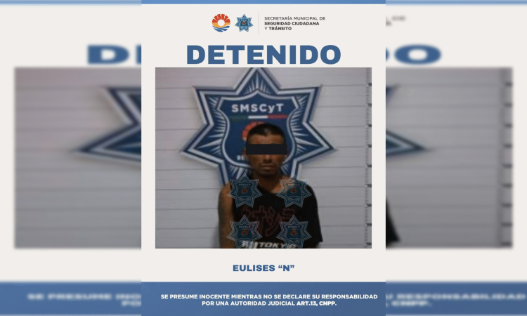 Cancún, 7 de agosto.- Agentes de la Secretaría de Seguridad Ciudadana y Tránsito de a Benito Juárez detuvieron a un individuo, presunta implicada en el delito de robo a casa habitación.En respuesta a un reporte al número de emergencias 9-1-1, policías municipales acudieron a la Supermanzana 96, donde un grupo de personas les entregó a un presunto ladrón.Al intervenir, una mujer señaló al sujeto de ingresar a su domicilio y haber sustraído unas cajas.Por lo anterior y ante el señalamiento directo de la víctima, Eulises “N”, de 39 años de edad y originario de Campeche, fue detenido y puesto a disposición de la Fiscalía General del Estado para los fines legales conducentes.